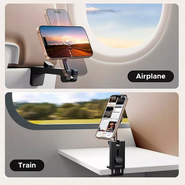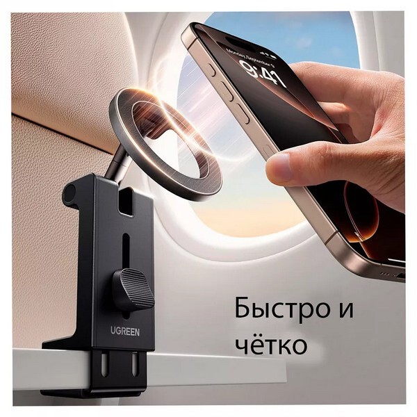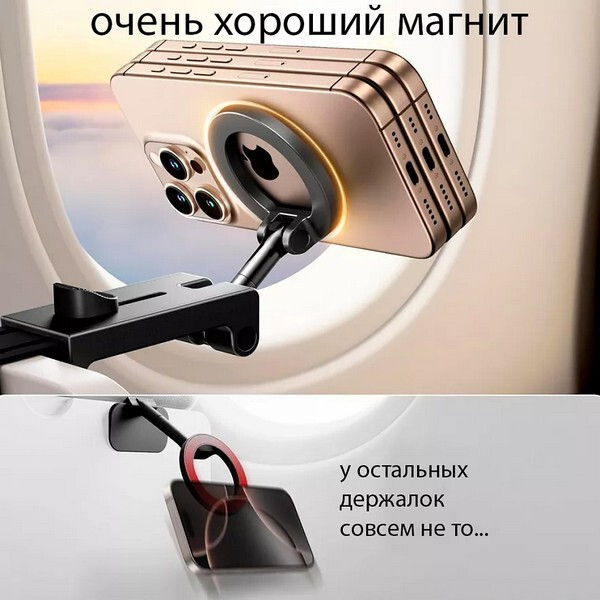 Прочная конструкция с широкой силиконовой подушкой гарантирует надежное сцепление и долговечность, делая его незаменимым аксессуаром для авиапутешествий. Совместим с iPhone 12–16 и чехлами MagSafe, а также с iPhone 11 и более ранними моделями при использовании магнитного металлического кольца. Этот держатель станет отличным выбором для тех, кто ценит удобство и надежность в дороге.