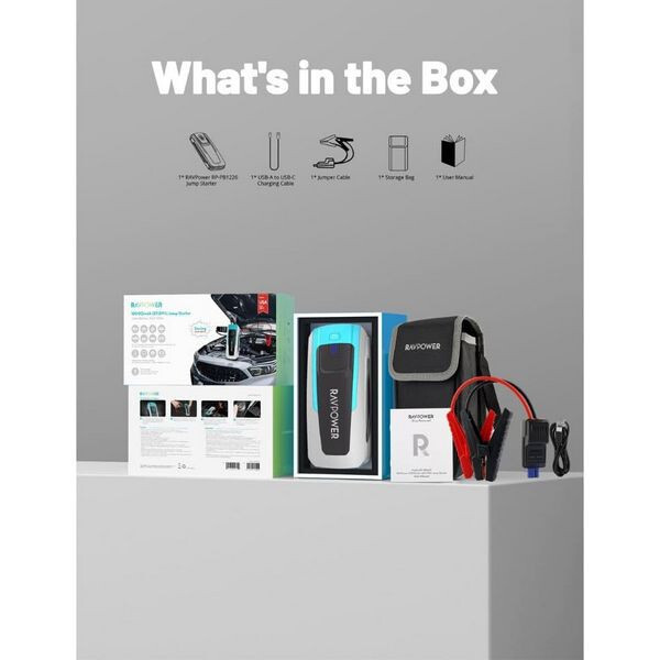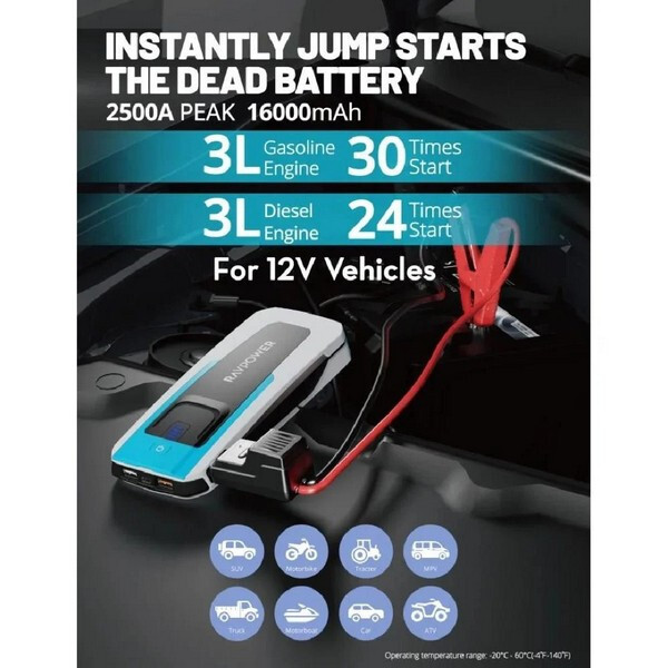 Пуско-зарядное устройство RAVPower Jump Starter 16000 mAh (RP-PB1226) - мощное пусковое устройство: компактное, но мощное, с емкостью 16000 мАч, обеспечивающее пиковый ток до 2500 А для запуска 12-вольтовых бензиновых и дизельных транспортных средств (до 3 л).