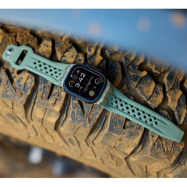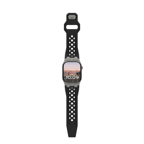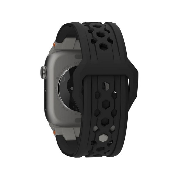 Ремешок каучуковый UAG Monarch для Apple Watch 49/45/44/42 мм черный/титановый (Black/Titanium) (194158114036) - ремешок, созданный для тех, кто ценит долговечность без ущерба стилю, создан, чтобы выдерживать непогоду и при этом улучшать свой внешний вид. Изготовленный из высококачественного фторэластомера FKM, Monarch обеспечивает превосходную производительность в любых условиях. Ремешок выдерживает экстремальные температуры, химикаты, ультрафиолетовые лучи, воду и пыль, что делает его идеальным спутником для приключений на открытом воздухе. Специальная фурнитура из нержавеющей стали титанового цвета добавляет нотку изысканности, гарантируя долговечность, на которую вы можете рассчитывать. Его система застежки-булавки надежно и гладко держит ваш ремешок, предотвращая зацепы и аккуратно убирая излишки ремешка для комфорта в течение всего дня. Перфорированный дизайн улучшает циркуляцию воздуха, помогая вам оставаться в прохладе, а смелые акцентные цвета добавляют современный вид.