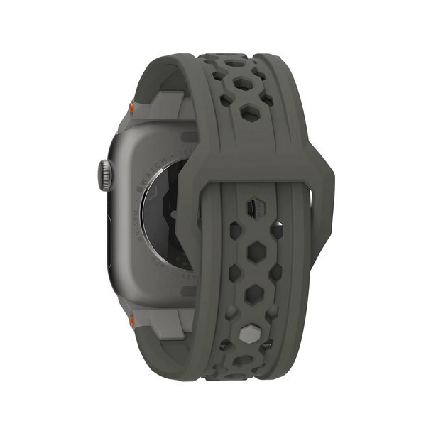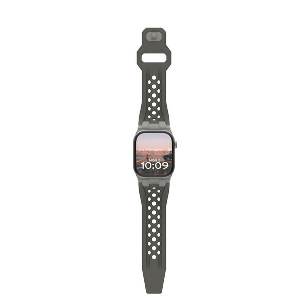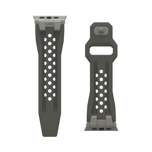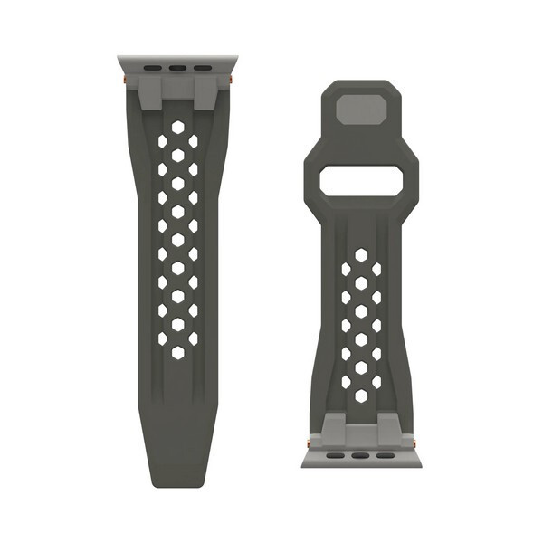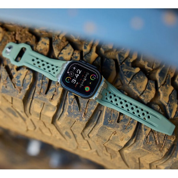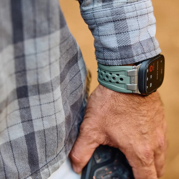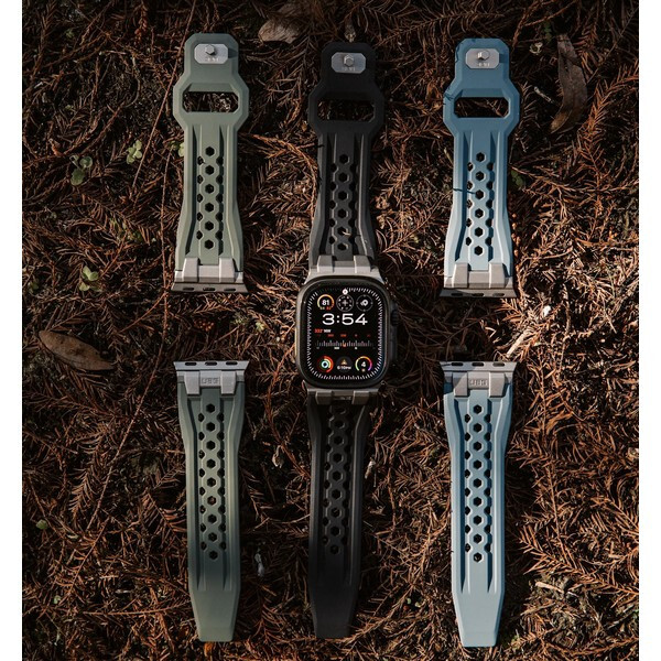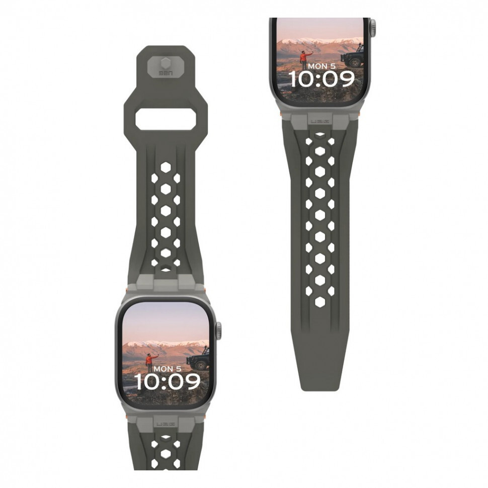 Ремешок каучуковый UAG Monarch для Apple Watch 49/45/44/42 мм зеленый/титановый (Olive/Titanium) (194158117236) - ремешок, созданный для тех, кто ценит долговечность без ущерба стилю, создан, чтобы выдерживать непогоду и при этом улучшать свой внешний вид. Изготовленный из высококачественного фторэластомера FKM, Monarch обеспечивает превосходную производительность в любых условиях. Ремешок выдерживает экстремальные температуры, химикаты, ультрафиолетовые лучи, воду и пыль, что делает его идеальным спутником для приключений на открытом воздухе. Специальная фурнитура из нержавеющей стали титанового цвета добавляет нотку изысканности, гарантируя долговечность, на которую вы можете рассчитывать. Его система застежки-булавки надежно и гладко держит ваш ремешок, предотвращая зацепы и аккуратно убирая излишки ремешка для комфорта в течение всего дня. Перфорированный дизайн улучшает циркуляцию воздуха, помогая вам оставаться в прохладе, а смелые акцентные цвета добавляют современный вид.