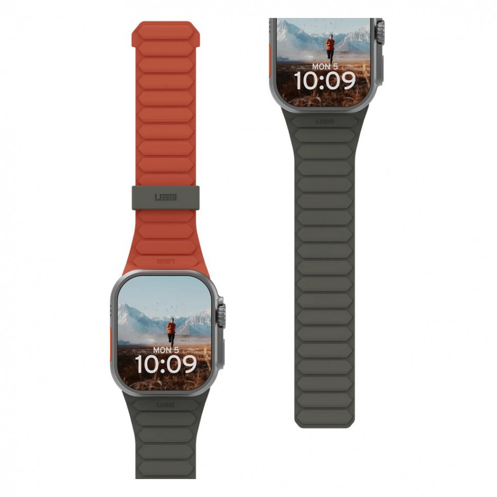 Ремешок силиконовый UAG Pathfinder Silicone для Apple Watch 49/45/44/42 мм (Olive/Rust) (194161117291) обеспечивает исключительный комфорт при ношении Apple Watch в течение всего дня и позволяет использовать три различные цветовые комбинации. Размер браслета: подходит для окружности запястья 150–200 мм.