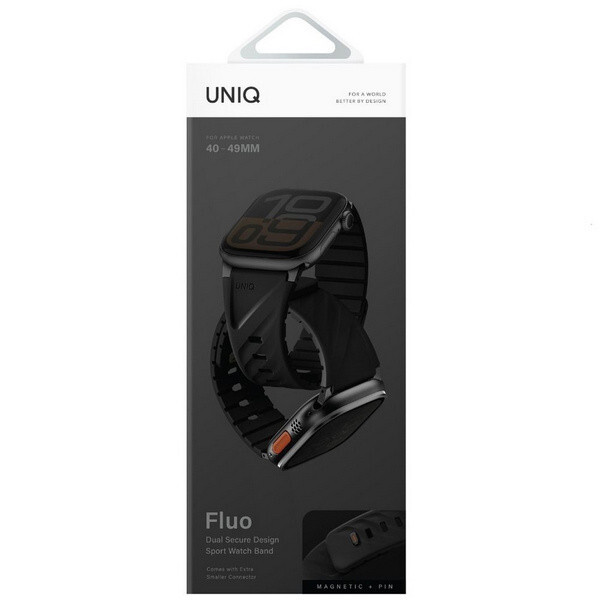 Ремешок Uniq Fluo для Apple Watch 40-49 мм (49-40MM-FLUOMBLK) Midnight Black освежает повседневный ремешок четкими линиями, скошенным силуэтом и изысканной текстурой, которая легко сочетается с любыми часами. Изготовленный из водостойкого силиконового каучука, он создан для того, чтобы двигаться вместе с вами, обеспечивая комфорт в течение всего дня и надежную посадку благодаря магнитной застежке, конструкции pin-and-tuck и фирменной пряжке из нержавеющей стали. Независимо от того, идете ли вы на работу, в спортзал или на выходные, Fluo сделает ваш ремешок стильным и функциональным. Он даже оснащен двумя универсальными коннекторами, подходящими для большинства часов от 40 до 49 мм.