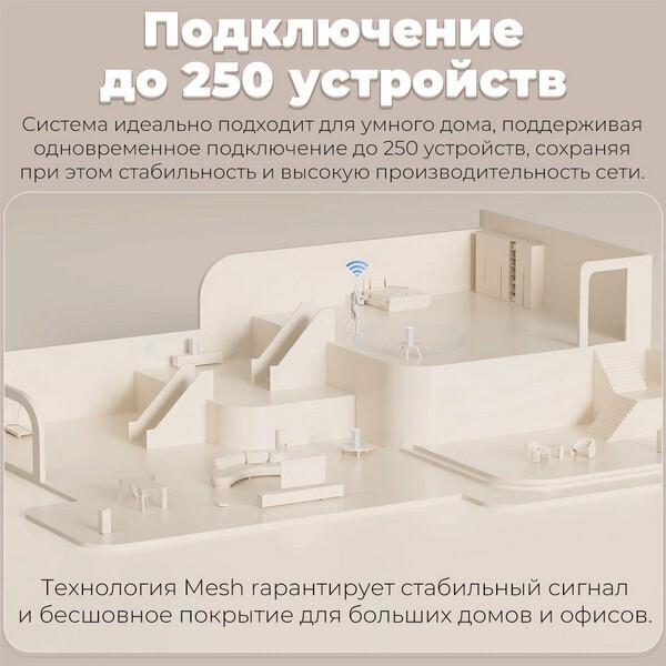 Одной из ключевых особенностей Xiaomi Mesh System AX3000 NE является поддержка технологии Mesh. Это означает, что вы можете объединить несколько таких роутеров в единую сеть с общим именем и паролем, создавая бесшовное покрытие Wi-Fi на большой площади. В отличие от традиционных усилителей сигнала, Mesh-система обеспечивает плавный переход между узлами сети без разрыва соединения. Комплект из нескольких таких устройств способен обеспечить стабильную беспроводную сеть на площади до 372 кв. метров. Он отлично подойдёт для больших квартир, многоэтажных домов или офисов, где требуется стабильная и быстрая беспроводная сеть.