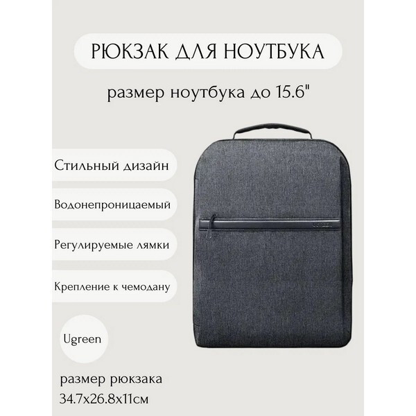 Рюкзак Ugreen LP664 Laptop Backpack B02 для ноутбуков до 15.6 дюймов (90798) темно-серый - классический городской рюкзак для ноутбука. Изготовлен их 600D высококачественной ткани Оксфорд, мягкая на ощупь, водонепроницаемой и износостойкой. Внутри есть отделение для ноутбука с размером экрана до 15,6 дюймов, отделение для вещей и документов, а также органайзер и кармашки для мелочей. Подклада из жемчужного хлопка, амортизирующая и устойчивая к сжатию, а также мягкая замшевая подклада защитят ваш ноутбук от повреждений. Молния YKK гарантирует плавное открывание и закрывание, и долгий срок службы. Минималистичный дизайн, усиленные швы и эргономичные s-образные широкие лямки делают этот рюкзак отличным компаньоном в повседневности.