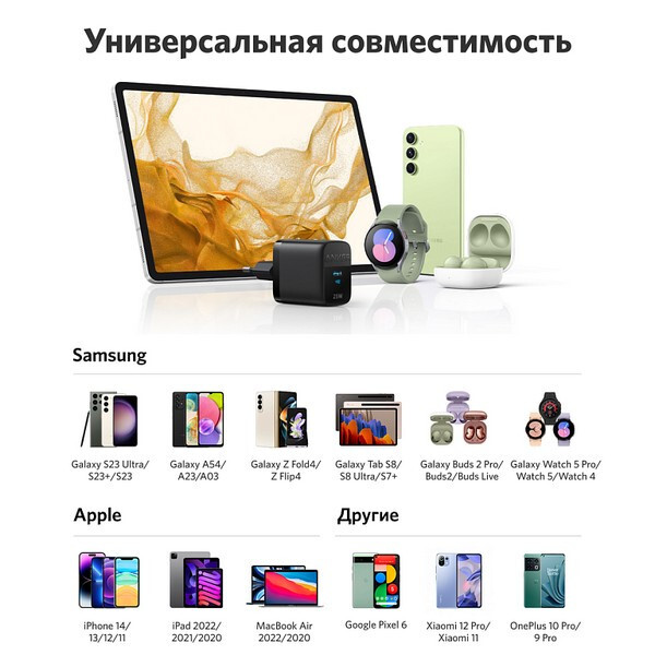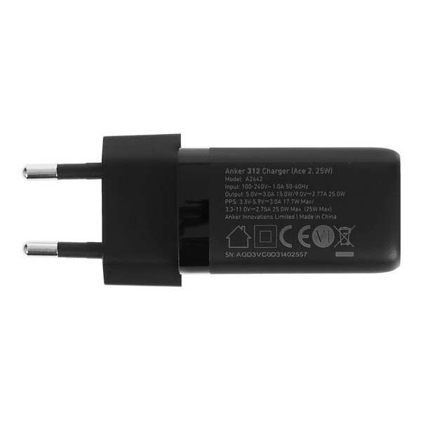 Сетевое зарядное устройство Anker 312 USB-C 25W (A2642G11) Black поддерживает сверхбыструю зарядку Samsung Super Fast Charging 2.0 мощностью 25 Вт, позволяющую полностью зарядить Samsung Galaxy S22 менее чем за 1.5 часа.