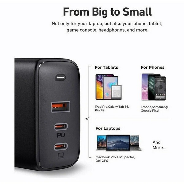Это зарядное устройство поддерживает функцию Dynamic Detect, которая обеспечивает высокую мощность и наилучшее перераспределение тока. Зарядка работает с большинством ноутбуков с USB-C и устройств PD, включая MacBook Pro 16 дюймов, MacBook Air, iPhone 11 / 11 Pro / 11 Pro Max / SE, Samsung S20+ / NOTE 20+, Google Pixel 4 / 3 XL, LG G7 / V50, iPad Pro 2020, iPad Air 2020, iPad mini 2020, Airpods Pro и другие. Все порты зарядного устройства расположены на достаточном расстоянии друг от друга, чтобы кабели от заряжаемых устройств было удобно подключать.
