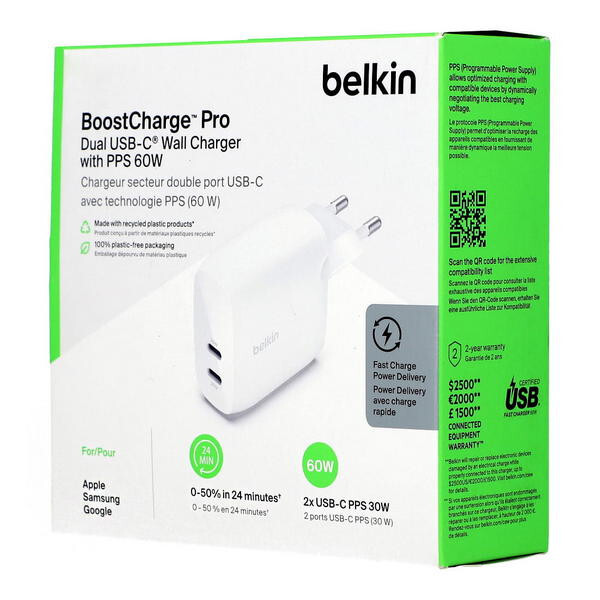 Сетевое зарядное устройство Belkin BoostCharge Pro Dual Usb-C with PPS 60W White (WCB010vfWH) - быстро и безопасно заряжайте свой iPhone, iPad, Samsung Galaxy и другие совместимые устройства с помощью нашего мощного зарядного устройства USB-C с PPS, 60 Вт.