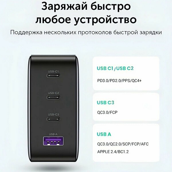 Зарядное устройство поддерживает стандарты быстрой зарядки Power Delivery, Quick Charge, AFC (Samsung), а также протоколы PD3.0 (PD2.0), QC4+ (QC4.0/QC3.0/QC2.0), PPS, AFC, APPLE 5V2.4A, BC1.2. Это позволяет заряжать устройства с различными требованиями к питанию. Устройство оснащено защитой от перегрева и перенапряжения, что обеспечивает безопасность использования и продлевает срок службы зарядного устройства.