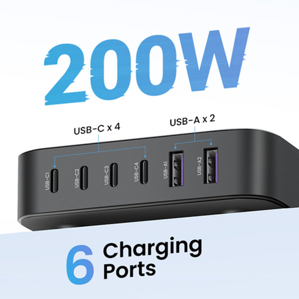 6 портов для подключения - 200Вт позволят вам подлкючить к этому хабу 3 макбука, 2 шт айфона и airpods.