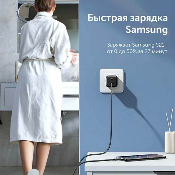 Мощность составляет 45 Вт, что позволяет быстро заряжать устройства. Поддержка стандартов ускоренной зарядки делает подзарядку ещё более быстрой