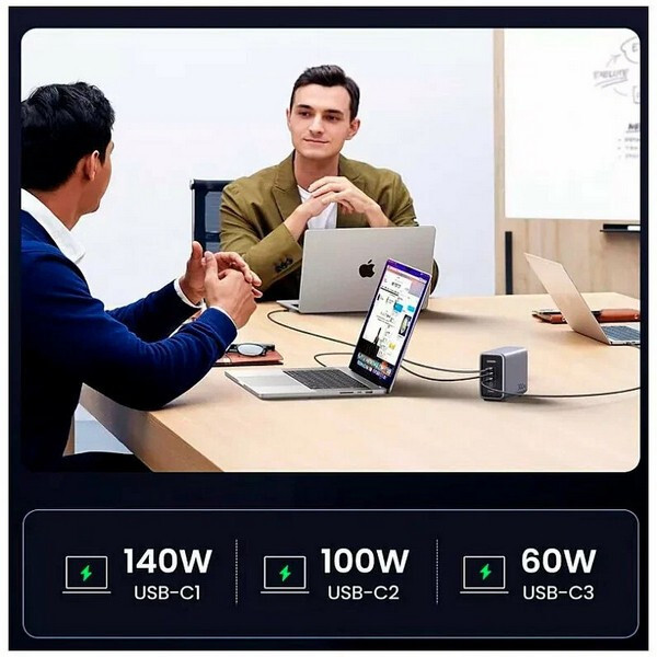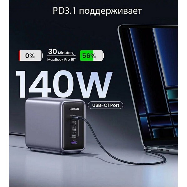 Сетевое зарядное устройство Ugreen CD333 Nexode 300W 5-Port PD GaN (90903B) серый - инновационный зарядник мощностью 300 Вт с поддержкой скорости зарядки PD 3.1, обеспечивающий максимальную выходную мощность до 140 Вт для USB-C1 и может заряжать MacBook Pro 2021-2024 годов 16 дюймов с 0 до 56% за 30 минут. При одновременном использовании USB C1, C2, C3 можно достичь максимальной мощности 300 Вт (140 Вт + 100 Вт + 60 Вт).