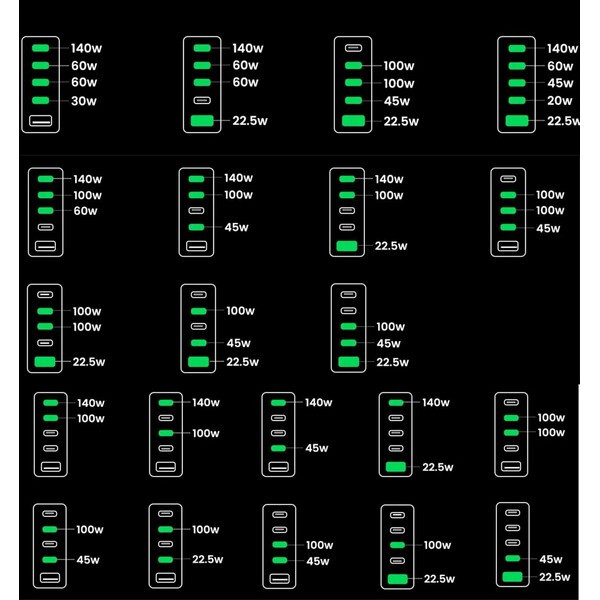 Благодаря отличной производительности зарядное устройство GaN может питать 3 ноутбука одновременно. С 4 портами USB-C и 1 портом USB-A зарядник USB C мощностью 300 Вт заряжает одновременно 5 устройств - от ноутбуков до планшетов и смартфонов, повышая вашу продуктивность в офисе. Универсальный дизайн делает зарядник более компактным и функциональным, не занимая много места и избавляя от путаницы с кабелями и неудобства использования нескольких зарядных устройств. Один зарядник может решить все проблемы с зарядкой.