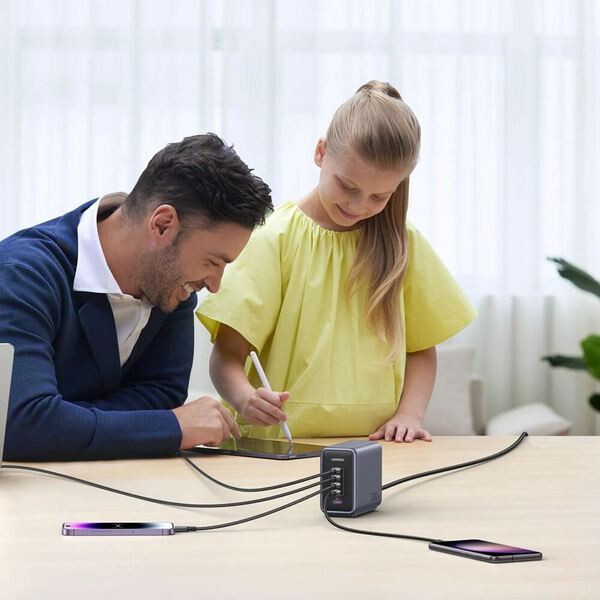 Благодаря отличной производительности зарядное устройство GaN может питать 3 ноутбука одновременно. С 4 портами USB-C и 1 портом USB-A зарядник USB C мощностью 300 Вт заряжает одновременно 5 устройств - от ноутбуков до планшетов и смартфонов, повышая вашу продуктивность в офисе. Универсальный дизайн делает зарядник более компактным и функциональным, не занимая много места и избавляя от путаницы с кабелями и неудобства использования нескольких зарядных устройств. Один зарядник может решить все проблемы с зарядкой.