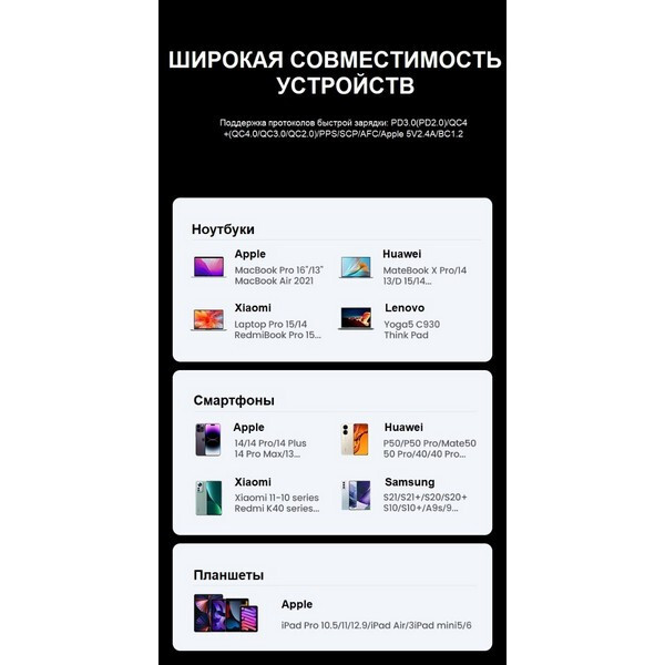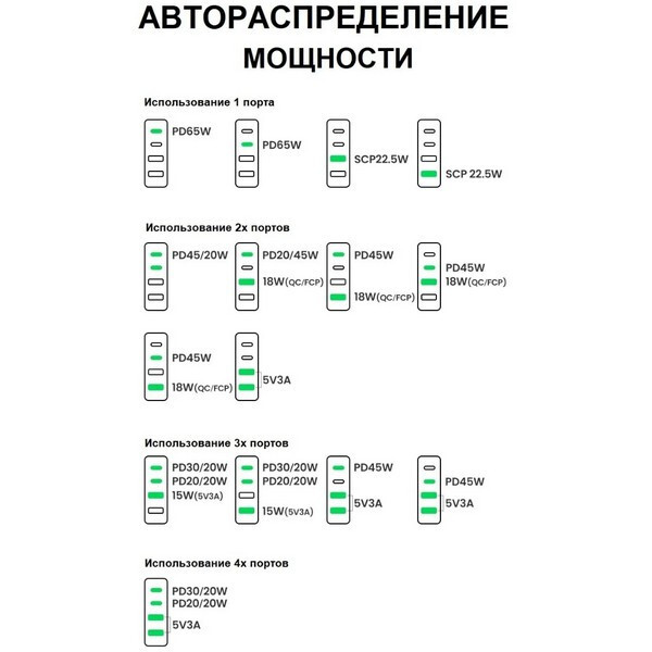 На устройстве расположено 4 порта: 2 USB и 2 USB Type-C. Подключение самого зарядного устройства к сети происходит посредством удобного комплектного кабеля