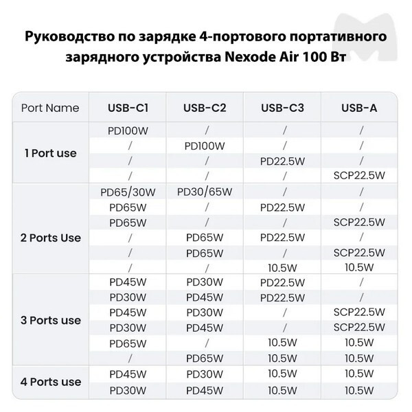 Выход USB-C1/C2: 5V 3A/9V 3A/12V 3A/15V 3A/20V 5A (100.0W Max)