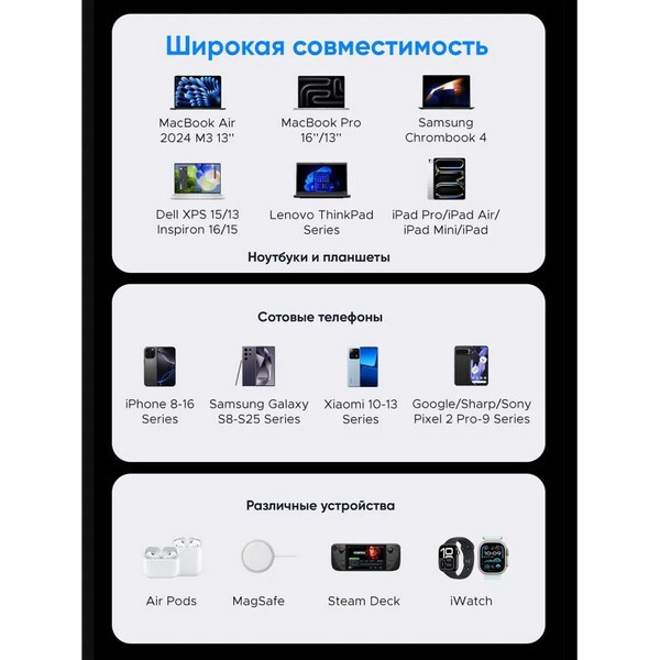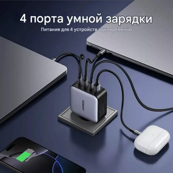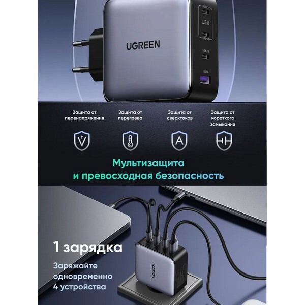 UGREEN X764 оснащен многоуровневой системой защиты, включая защиту от перегрузки, перегрева и короткого замыкания, что обеспечивает безопасность как самого зарядного устройства, так и подключенных к нему гаджетов. Компактные размеры и легкий вес делают его особенно удобным для путешествий, а высокая эффективность и универсальность позволяют заменить несколько зарядных устройств одним.