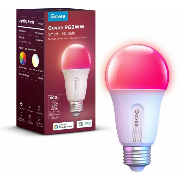 Умная лампа Govee Smart Light Bulb RGBWW Wifi+Bluetooth 800 Lm (H6004CC1) имеет мощность 9 Вт и подходит для установки в осветительные приборы с цоколем стандарта E27. Она поддерживает плавную регулировку освещения в пределах цветовой температуры 2700-6500K и разноцветный спектр RGB для создания уютной обстановки в помещении. Пластиковая колба с матовым покрытием обеспечивает равномерное распределение светового потока по всему пространству. Управление устройством возможно по Wi-Fi с помощью приложения на смартфоне и голосового ассистента. Ресурс службы светодиодной лампы Govee Smart Light Bulb RGBWW составляет 20000 часов.
