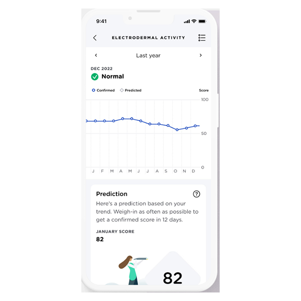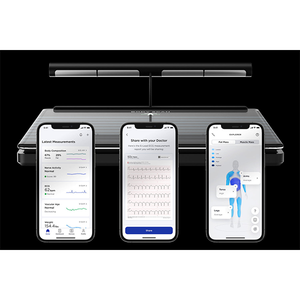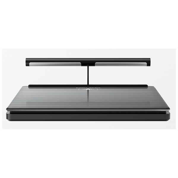 Одна из главных особенностей Body Scan - наличие выдвижной ручки, в которой находятся четыре дополнительных электрода из нержавеющей стали для измерения ЭКГ в шести отведениях и сегментарного анализа состава тела (еще 14 электродов ITO, плюс четыре датчика веса расположены в самой платформе из высокопрочного закаленного стекла). Полученная статистика отображается на цветном ЖК-экране (3,2 дюйма) с высоким разрешением. Конечно, всю информацию можно посмотреть и в приложении.