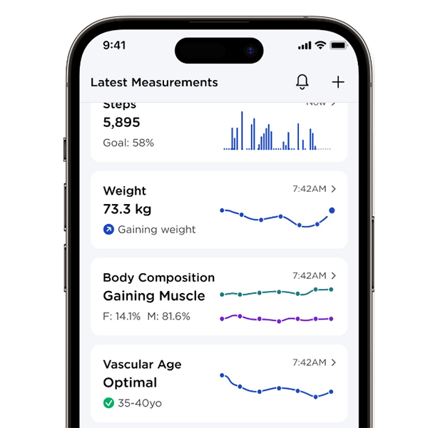 Помимо состава тела, Body Scan предоставляют информацию о частоте сердечных сокращений и измеряют ЭКГ. Все показатели выводятся в приложении или на 3,2-дюймовом цветном экране. Есть синхронизация с Apple HealthKit и Google Fit.