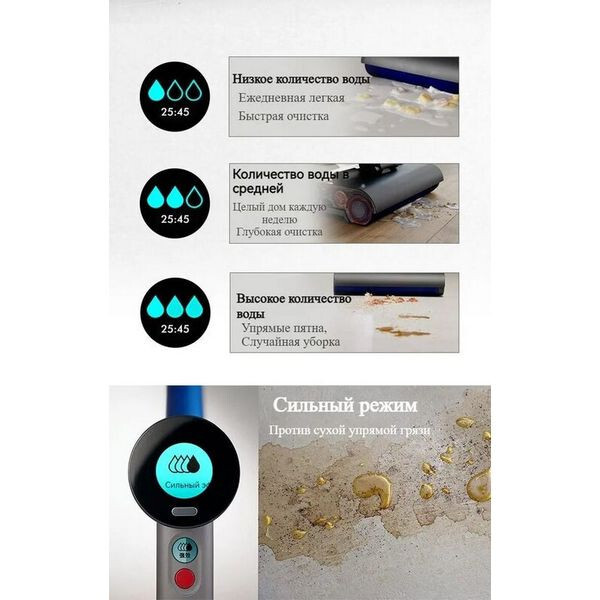 Жидкокристаллический дисплей отображает состояние работы пылесоса в реальном времени, позволяя вам регулировать объем воды и режим работы.