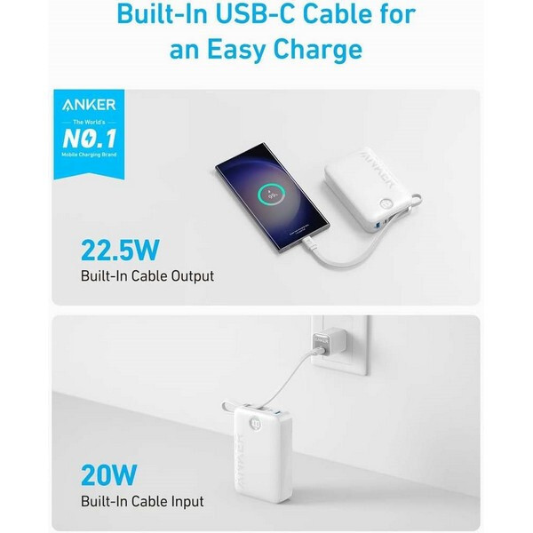 Что вы получаете: Anker Power Bank (20000 мАч, 22,5 Вт, встроенный кабель USB-C), руководство.