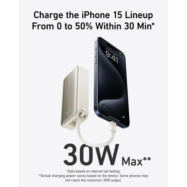 Встроенный кабель USB-C. Используйте встроенный кабель USB-C для зарядки смартфонов, планшетов и ноутбуков, а также для подзарядки самого блока питания — он отвечает всем вашим потребностям в зарядке!