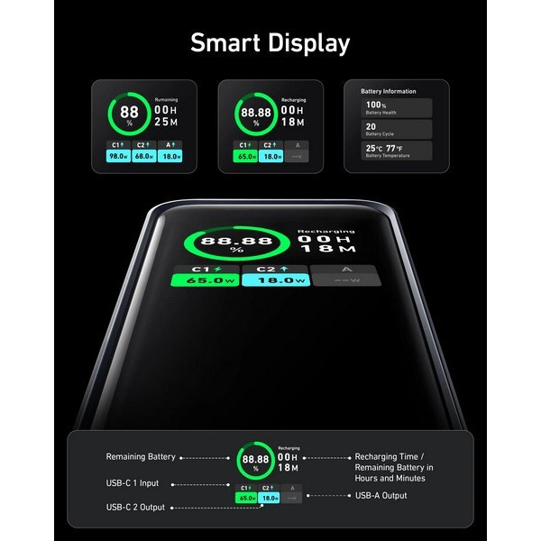 Получайте информацию в режиме реального времени: будьте в курсе событий с помощью интеллектуального цифрового дисплея, который в режиме реального времени отображает информацию об оставшейся емкости аккумулятора, входной и выходной мощности, предоставляя вам полный контроль и обзор внешнего аккумулятора.