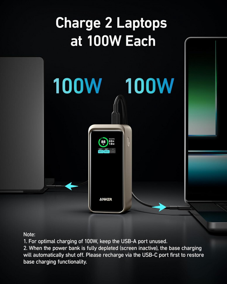 Общая мощность 200 Вт. Оснащен двумя мощными портами USB-C и одним портом USB-A общей мощностью 200 Вт, позволяет быстро заряжать два ноутбука одновременно по 100 Вт каждый для максимальной эффективности.