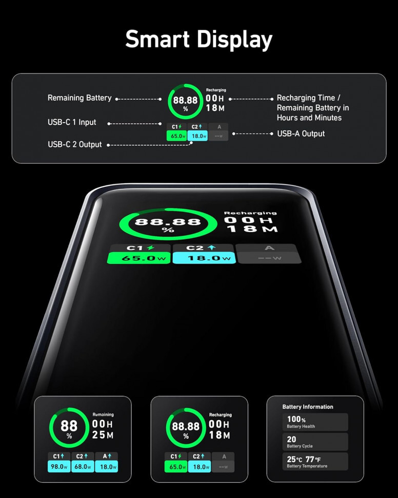 Получайте информацию в режиме реального времени: будьте в курсе событий с помощью интеллектуального цифрового дисплея, который в режиме реального времени отображает информацию об оставшейся емкости аккумулятора, входной и выходной мощности, предоставляя вам полный контроль и обзор внешнего аккумулятора.