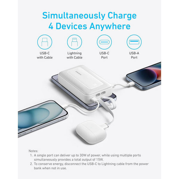 Заряжайте 4 устройства одновременно: наслаждайтесь зарядкой нескольких устройств в любом месте с помощью встроенных кабелей USB-C и Lightning, порта USB-C и порта USB-A.