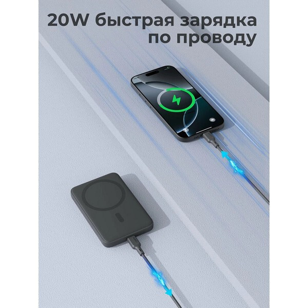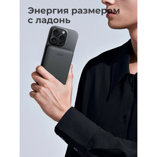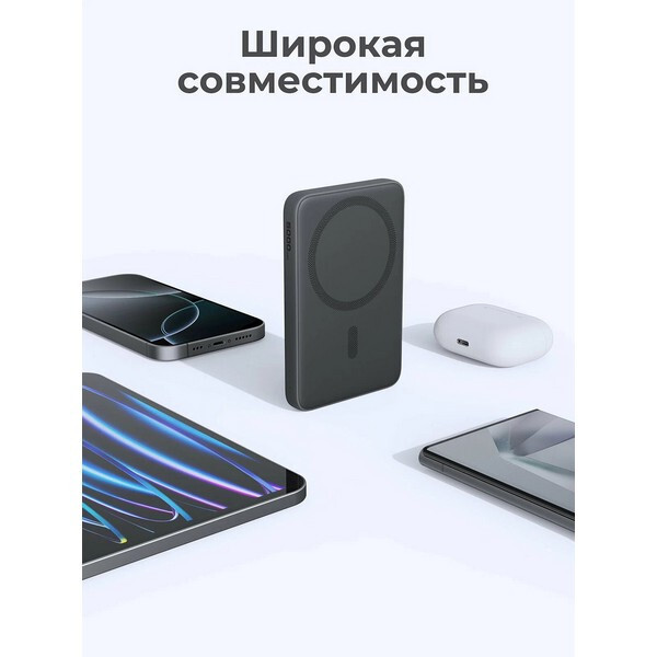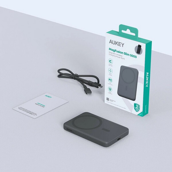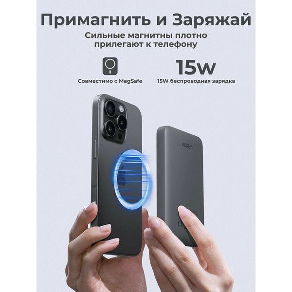 Внешний аккумулятор Aukey MagFusion Slim 5000 мАч (APB-PB-MS03BK) Black может похвастаться тонким и портативным дизайном, толщина которого составляет всего 1,3 см. Его сверхкомпактная форма обеспечивает легкую портативность, что делает его идеальным компаньоном для использования в дороге без ущерба для мощности. Магнитное крепление и зарядка: ощутите будущее зарядки с помощью магнитной беспроводной технологии, полностью совместимой с MagSafe. Легко прикрепите свой смартфон, совместимый с MagSafe устройства к внешнему аккумулятору для бесперебойной и безопасной зарядки. Быстрая зарядка: благодаря входу USB-C мощностью 18 Вт зарядка вашего внешнего аккумулятора происходит быстрее, чем когда-либо. Попрощайтесь с долгим временем ожидания и вернитесь к полной мощности в кратчайшие сроки. Оставайтесь на связи и наслаждайтесь непрерывной зарядкой, где бы вы ни находились. Безопасность и надежность: встроенные средства защиты защищают ваши устройства от чрезмерного тока, перегрева и перезарядки.
