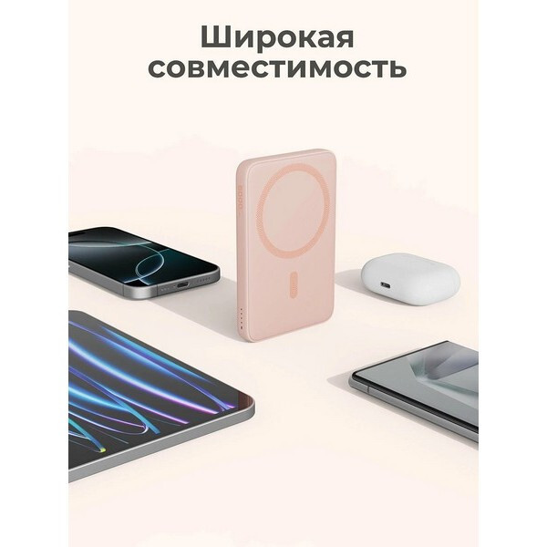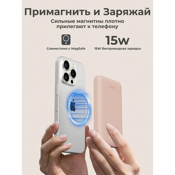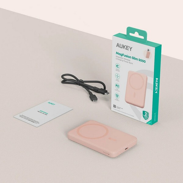 Внешний аккумулятор Aukey MagFusion Slim 5000 мАч (APB-PB-MS03PK) Pink может похвастаться тонким и портативным дизайном, толщина которого составляет всего 1,3 см. Его сверхкомпактная форма обеспечивает легкую портативность, что делает его идеальным компаньоном для использования в дороге без ущерба для мощности. Магнитное крепление и зарядка: ощутите будущее зарядки с помощью магнитной беспроводной технологии, полностью совместимой с MagSafe. Легко прикрепите свой смартфон, совместимый с MagSafe устройства к внешнему аккумулятору для бесперебойной и безопасной зарядки. Быстрая зарядка: благодаря входу USB-C мощностью 18 Вт зарядка вашего внешнего аккумулятора происходит быстрее, чем когда-либо. Попрощайтесь с долгим временем ожидания и вернитесь к полной мощности в кратчайшие сроки. Оставайтесь на связи и наслаждайтесь непрерывной зарядкой, где бы вы ни находились. Безопасность и надежность: встроенные средства защиты защищают ваши устройства от чрезмерного тока, перегрева и перезарядки.