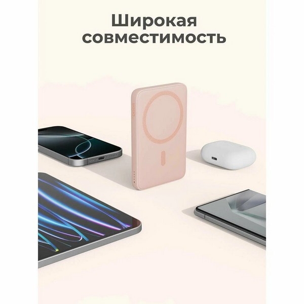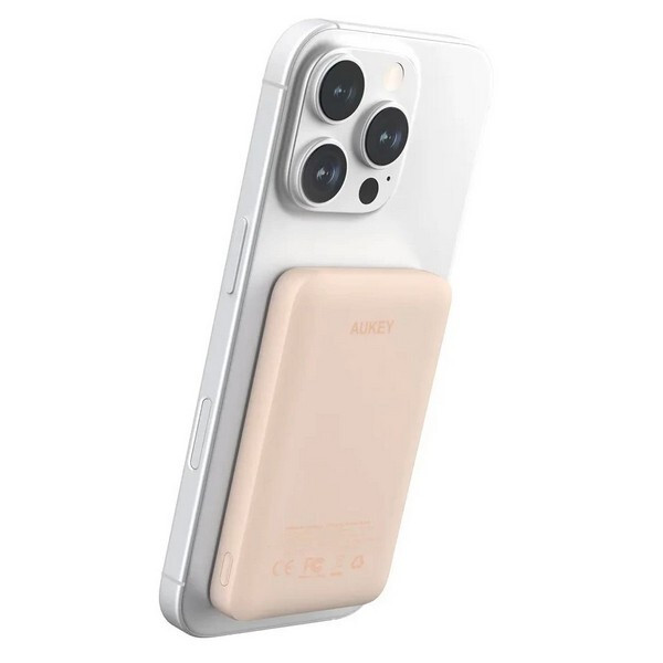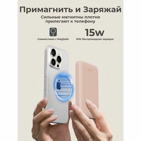Внешний аккумулятор Aukey Magnetic 10000 мАч (APB-PB-MS04PK) Pink может похвастаться тонким и портативным дизайном, толщина которого составляет всего 1,9 см. Его сверхкомпактная форма обеспечивает легкую портативность, что делает его идеальным компаньоном для использования в дороге без ущерба для мощности. Магнитное крепление и зарядка: ощутите будущее зарядки с помощью магнитной беспроводной технологии, полностью совместимой с MagSafe. Легко прикрепите свой iPhone 12 / 13 / 14 / 15 / 16 или другие совместимые с MagSafe устройства к внешнему аккумулятору для бесперебойной и безопасной зарядки. Быстрая зарядка: благодаря входу USB-C мощностью 18 Вт зарядка вашего внешнего аккумулятора происходит быстрее, чем когда-либо. Попрощайтесь с долгим временем ожидания и вернитесь к полной мощности в кратчайшие сроки. Оставайтесь на связи и наслаждайтесь непрерывной зарядкой, где бы вы ни находились. Безопасность и надежность: встроенные средства защиты защищают ваши устройства от чрезмерного тока, перегрева и перезарядки.