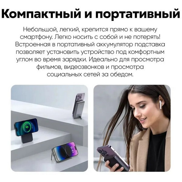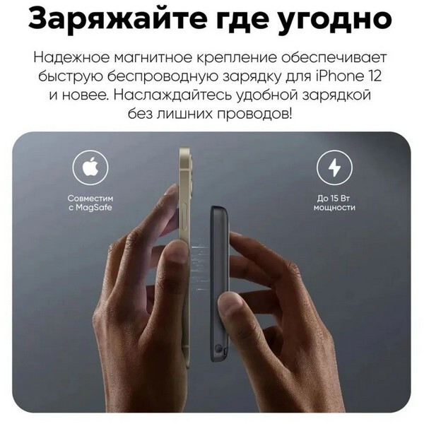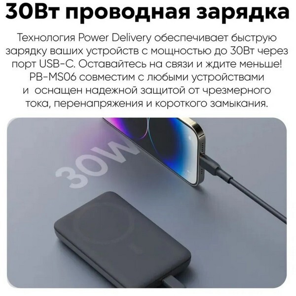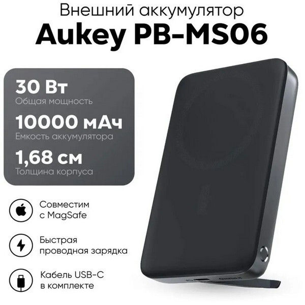 Внешний аккумулятор Aukey Magnetic2 10000 мАч (APB-PB-MS06) Black. Максимальная мощность беспроводной зарядки Qi2 15 Вт: совместима с мощным магнитным зарядным устройством и обеспечивает быструю беспроводную зарядку мощностью до 15 Вт для iPhone 12 и более новых моделей. Наслаждайтесь легкой и удобной зарядкой без необходимости использования кабелей. Быстрая проводная зарядка мощностью 30 Вт: функция быстрой проводной зарядки мощностью 30 Вт обеспечивает быструю и эффективную зарядку через порт USB-C, сводя к минимуму время простоя и позволяя вам оставаться на связи. Складная подставка: встроенная удобная складная подставка позволяет расположить устройство под удобным углом во время зарядки — идеально для просмотра фильмов или совершения видеозвонков. Магнитное выравнивание. Компактный и портативный. Множество защит, включая защиту от перегрузки по току, защиту от перенапряжения и защиту от короткого замыкания.