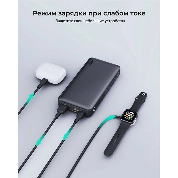 Аккумулятор оснащен сквозной зарядкой, что позволяет заряжать его, когда он подключен к заряжаемому устройству. Это обеспечивает непрерывную зарядку и позволяет вам не беспокоиться о том, что аккумулятор разрядится в самый неподходящий момент. Кроме того, вы можете заряжать несколько устройств одновременно.