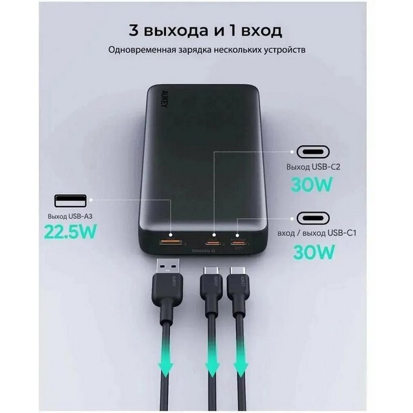 Внешний аккумулятор Aukey Sprint X 20000 мАч 30W (APB-PB-Y42) Grey оснащен портом USB Type-A и двумя разъемами USB Type-C для питания разных типов мобильных устройств. Есть поддержка ускоренной зарядки по разным технологиям. Системы защиты от короткого замыкания, перегрузки, перегрева и перепадов напряжения гарантируют надежную и безопасную работу АКБ.