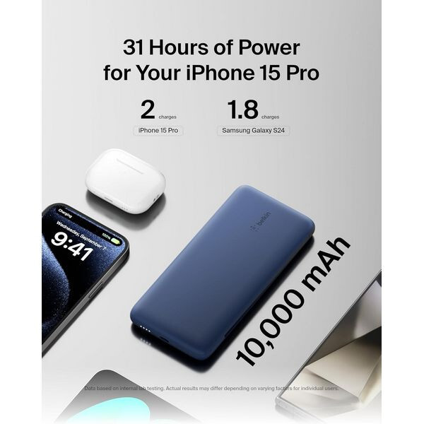 Внешний аккумулятор Belkin Boost Charge with Integrated Cables 10000 mAh (BPB006btBLU) Blue поставляется с собственными встроенными кабелями, так что вам никогда не придется снова брать с собой собственный. Заряжайте свои смартфоны и планшеты на ходу с помощью подключенных кабелей Lightning и USB-C и наслаждайтесь сквозной зарядкой, которая позволяет одновременно заряжать устройство и аккумулятор.