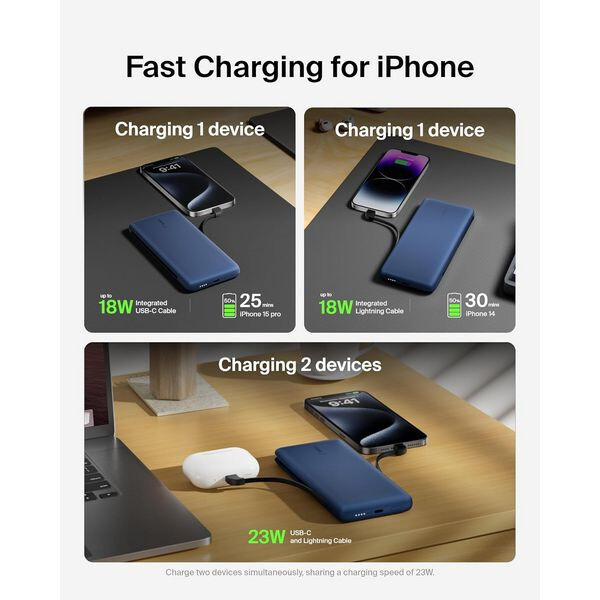 Встроенные кабели Lightning и USB-C подключены к портативному зарядному устройству. Заряжайте два устройства одновременно общей мощностью 23 Вт или используйте сквозную зарядку для зарядки одного устройства мощностью 18 Вт, одновременно заряжая внешний аккумулятор.