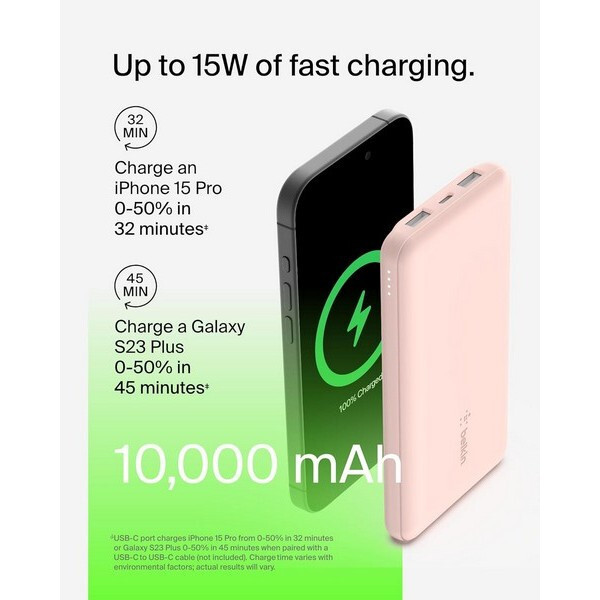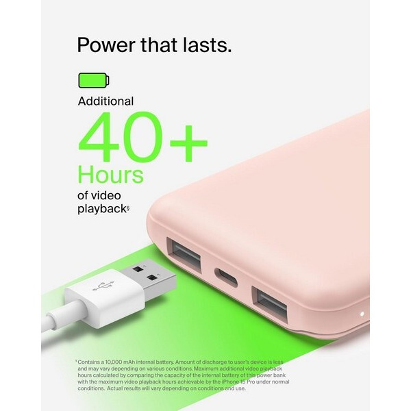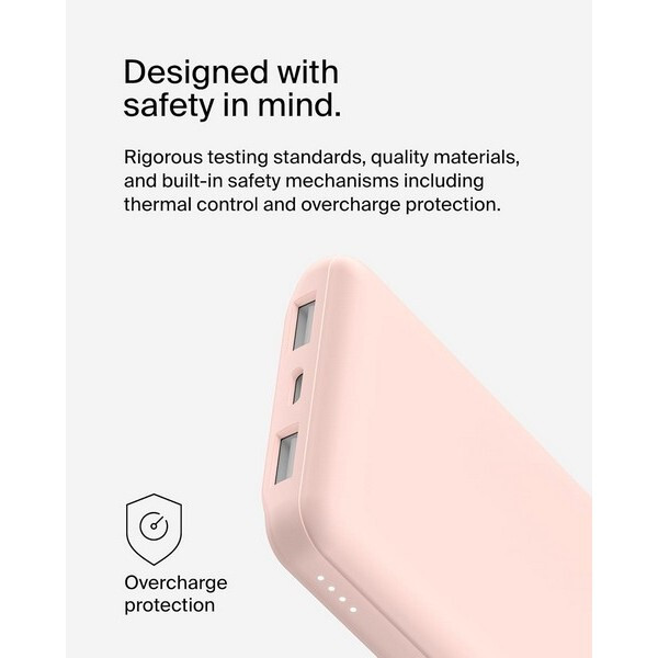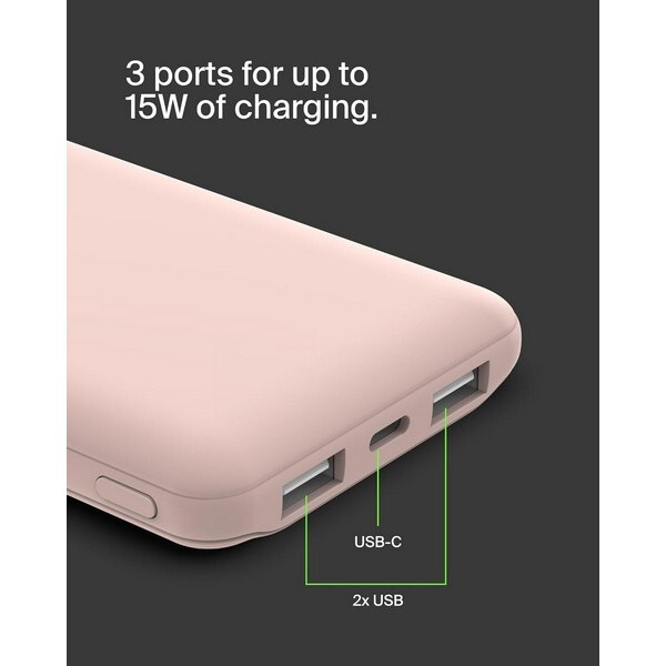 Внешний аккумулятор Belkin BoostCharge 10000mAh (BPB011btRG) Rose Gold представляет собой внешний аккумулятор, который способен обеспечить до 40 часов автономной работы вашего смартфона. В модели предусмотрены разъемы USB-A и USB-C, последний позволит зарядить гаджет с мощностью до 15 Вт. Емкость аккумулятора составляет 10000 мАч, благодаря чему его хватит на две полные зарядки смартфона iPhone 12/13 серии. Внешний аккумулятор Belkin 10000mAh выполнен в корпусе из прочного пластика. Компактный обтекаемый дизайн аксессуара позволит брать с собой куда угодно, ведь он легко помещается в сумке или кармане. Модель поддерживает функцию сквозной зарядки, позволяющую осуществлять одновременное пополнение емкости батареи подключенного гаджета и самого внешнего аккумулятора. На устройстве имеется индикатор уровня заряда.