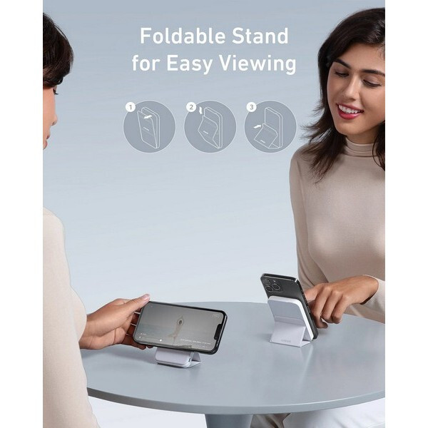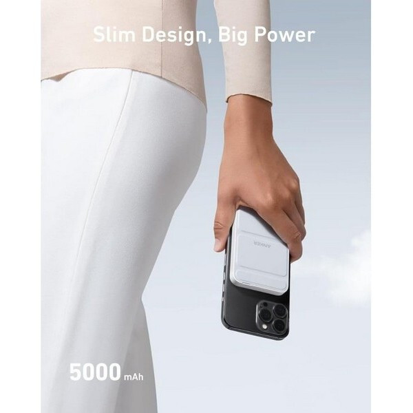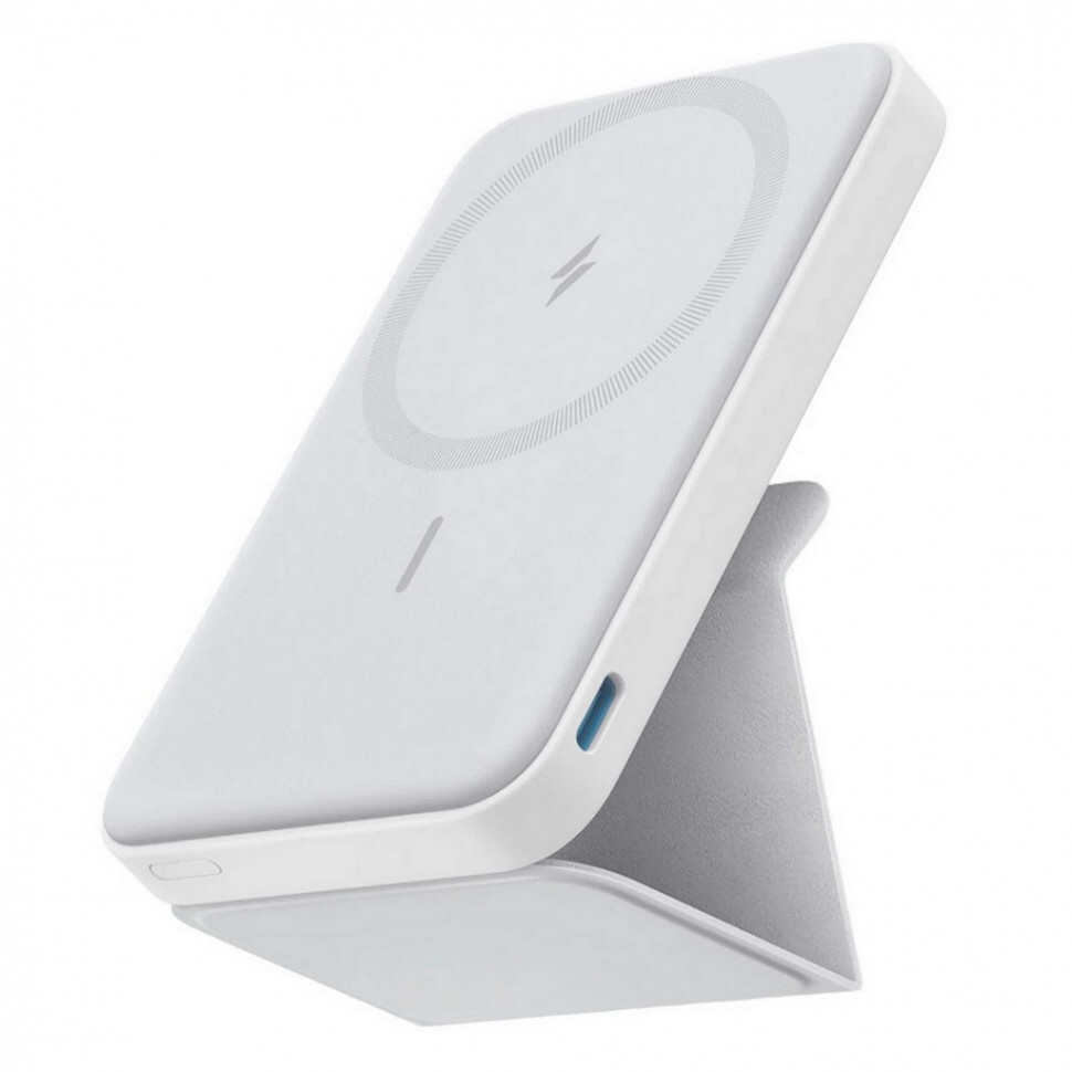 Внешний аккумулятор с магнитной беспроводной зарядкой Anker MagGo 622 5000 мАч (A1614H23) белый - тонкий 0,5-дюймовый (12,8 мм) внешний аккумулятор, разработанный для iPhone 14/13/12. Его встроенная складная подставка обеспечивает удобный просмотр во время зарядки, а сверхмощные магниты обеспечивают идеальное выравнивание для эффективной беспроводной зарядки. Благодаря технологии Mini Cell он сочетает высокую производительность с компактным дизайном. Наслаждайтесь превосходной безопасностью с технологией Anker MultiProtect и легко заряжайте через USB-C. Оставайтесь заряженными на ходу, легко принимая звонки и делая селфи!
