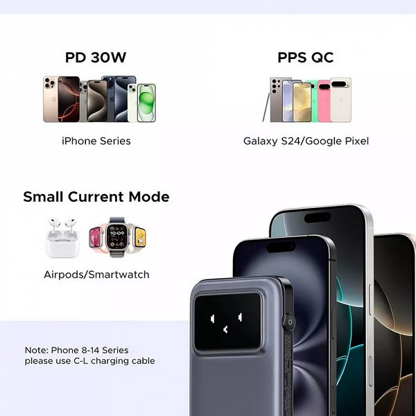 Встроенный TFT-дисплей с милыми эмодзи показывает уровень заряда батареи, делая его использование простым и приятным, и избавляя от необходимости гадать, когда нужно подзарядить устройство. Этот внешний аккумулятор совместим с большинством популярных смартфонов и планшетов, включая iPhone 16/15/14/13/12/11 серии, Galaxy S24/S23, Pixel 7 Pro и другие Android-устройства. Встроенный USB-C кабель может заряжать iPhone 16 и 15 серии. Для зарядки iPhone 14 и более ранних моделей потребуется USB-A или USB-C кабель с разъемом Lightning.
