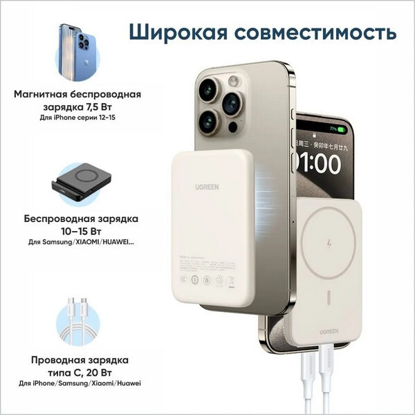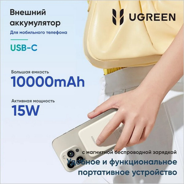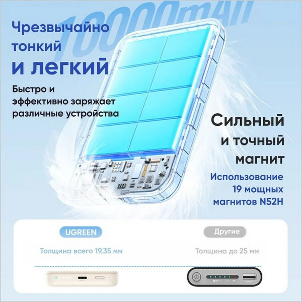 Внешний аккумулятор Ugreen PB561 10000mAh Magnetic Wireless Power Bank 20W (25208) белый - это удобное и функциональное портативное устройство в белом цвете, обладающее магнитными свойствами.