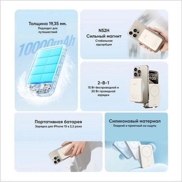 Аккумулятор имеет ёмкость 10000mAh, что позволяет быстро и эффективно заряжать различные устройства в любом месте. Он оснащен магнитным дизайном, который позволяет легко крепить аккумулятор к магнитным поверхностям, что делает его удобным и практичным в использовании. Устройство также поддерживает беспроводную зарядку, что делает процесс зарядки еще более удобным и без лишних проводов.