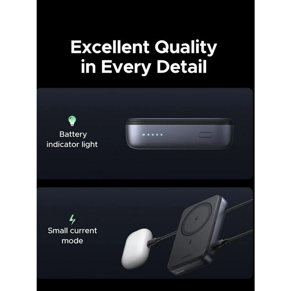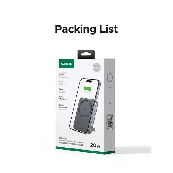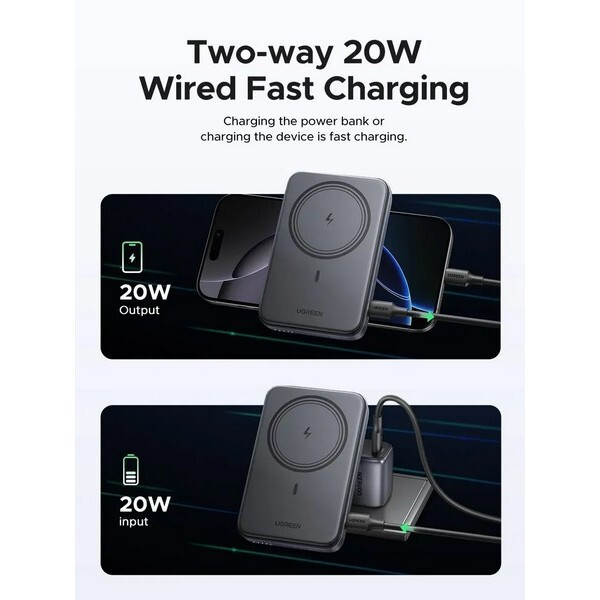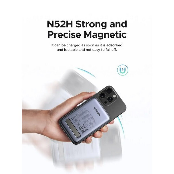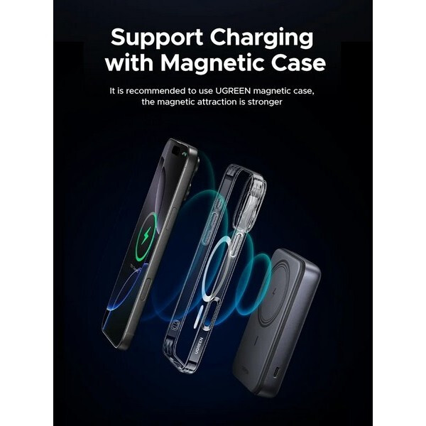 Внешний аккумулятор Ugreen PB562 Magnetic Wireless Power Bank 10000mAh (55140) серый космос - это компактное и мощное устройство с ёмкостью 10000 мАч, предназначенное для быстрой и надёжной подзарядки ваших гаджетов в любых условиях. Поддерживает технологию быстрой зарядки до 20 Вт, благодаря чему вы сможете оперативно восполнить заряд смартфона, планшета или других устройств, поддерживающих Power Delivery (PD) или Quick Charge.