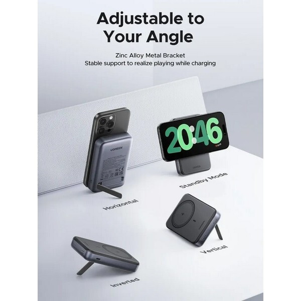 Одна из ключевых особенностей модели — встроенная подставка, которая позволяет удобно установить смартфон во время зарядки, например, для просмотра видео или видеозвонков. Это делает устройство особенно удобным в поездках, командировках и повседневном использовании.