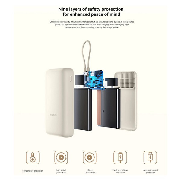 Внешний аккумулятор Xiaomi Power Bank 20000mAh (BHR8975GL) Blue оснащен встроенным кабелем USB Type-C и разъемом USB Type-A для подзарядки устройств. Технологии защиты от перегрузки, короткого замыкания и перегрева гарантируют стабильную работу.