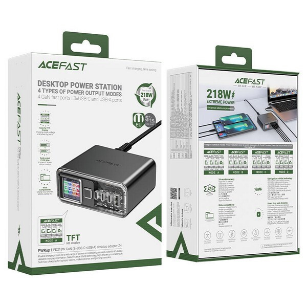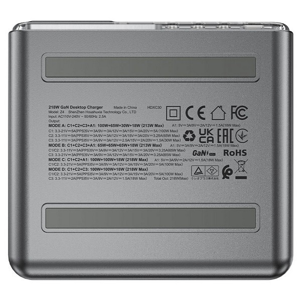 Этот источник питания для ноутбуков и смартфонов компьютеров изготовлен из негорючего материала, обеспечивая безопасное использование. С применением технологии нитрида галлия (GaN), он компактен по размеру, при этом обладает контролем за температурой и более высокой эффективностью зарядки. Имеется возможность переключения между 4 режимами зарядки, обеспечивая высокую мощность в 218 Вт, что соответствует максимальной зарядной мощности различного оборудования.