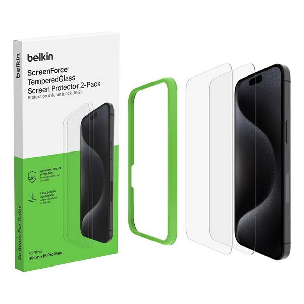 Защитное стекло Belkin ScreenForce TemperedGlass для iPhone 15 Pro Max (2 шт) - защитите свой новый iPhone с помощью тонкого высококачественного закаленного стекла, которое, как доказано испытаниями, обеспечивает превосходный уровень защиты от падений, ударов и других повседневных воздействий.