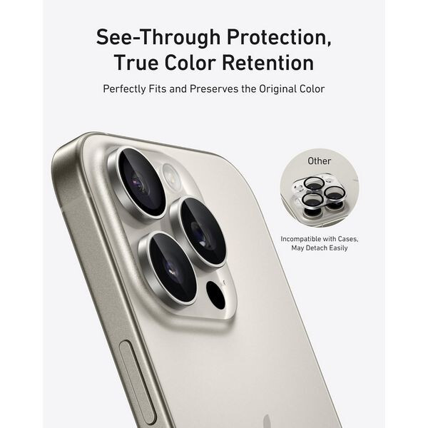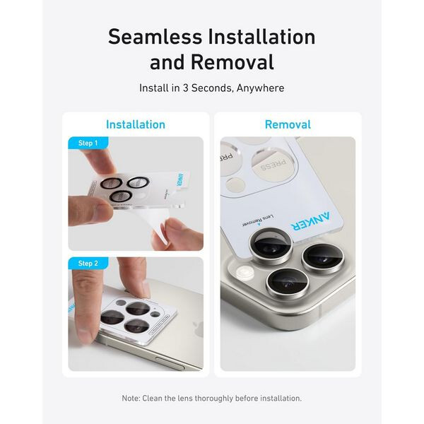 Защитное стекло для камеры Anker Camera Lens Protector для iPhone 16 Pro/16 Pro Max (Pack of 2) A720GH6A - простая установка и снятие, разработано для простого нанесения без образования пузырьков и легкого удаления без остатка.