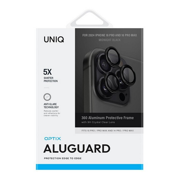 Защитное стекло для камеры Uniq OPTIX Camera Lens AluGuard для iPhone 16 Pro/16 Pro Max (IP6.3P-6.9P(2024)-ALENSBLK) Black надежно защитит камеру Apple iPhone от царапин и повреждений и поможет вам получить кристально чистое изображение на видео и фотоснимках. Изготовлено из закаленного стекла, устойчивого к износу. Легко устанавливается, идеально повторяет контуры камеры. Олеофобное покрытие значительно уменьшает количество отпечатков пальцев и других загрязнений.